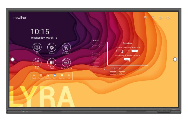 Das 86 Zoll Display TT-8621Q aus der neuen NewLine LYRA Serie ist eine leistungsstarke Lösung für Unterrichts- und Meetingräume der nächsten Generation und bietet mit dem integrierten neuen Betriebssystem Android 11 eine nochmal verbesserte Sicherheit. Neben einer Ultra-HD Auflösung mit 3840x2160 Pixel und der Helligkeit von 400 cd/m² bietet das NewLine LYRA Display natürlich noch zahlreiche weitere Features die sich sehen lassen können. Das TT-8621Q besitzt eine Bildschirmoberfläche aus gehärtetem Glas der Stufe 7H, das besonders in Klassen- und Schulungsräumen mit hoher Nutzerfrequenz sinnvoll und damit absolut alltagstauglich ist. Egal ob Sie auf dem Touch-Display den NewLine Stylus-Pen, einen Finger oder die ganze Hand verwenden, das Arbeiten mit dem Windows Ink kompatiblen NewLine TT-8621Q wird Sie begeistern. Der Touch-Display bietet, neben dem antimikrobiell gehärteten Glas, auch noch eine Blendschutz- und Anti-Fingerabdruck-Beschichtung. Zusätzlich ermöglicht Ihnen der integrierte Blaulichtfilter ein gesünderes und ermüdungsfreieres Arbeiten am Display. Mit Wi-Fi 6, Bluetooth 5.0, zwei integrierten Lautsprechern und integriertem Mediaplayer hat dieses NewLine Touch-Display aus der LYRA Serie bereits alle notwendigen Werkzeuge für eine umfassende Kommunikation und Zusammenarbeit an Bord. Mit einer optionalen Videokonferenz-Kamera können Sie Ihren NewLine TT-8621Q Display sogar zu einer All-in-one-Lösung machen, denn der entsprechende USB-Port für eine Kamera ist auf dem Display oben mittig bereits vorhanden. Die im Lieferumfang der NewLine LYRA-Serie bereits enthaltenen Software-Pakete decken die wesentlichsten Anforderungen an interaktive Unterrichts- und Schulungsräume ab und helfen Ihnen dabei, den Unterricht, die Schulung oder auch das nächste Meeting optimal vorzubereiten und zu gestalten. Im Einzelnen werden mit dem NewLine Touch-Display folgende NewLine Funktionstools geliefert: Whiteboard, Cast, Broadcast, App-Store, ReactivSuite, ClassroomTools sowie Engage (nach Registrierung) als dauerhafte Lizenzen. Das Tool DisplayManagement ist mit einer 3 Jahre Lizenz ebenfalls enthalten.